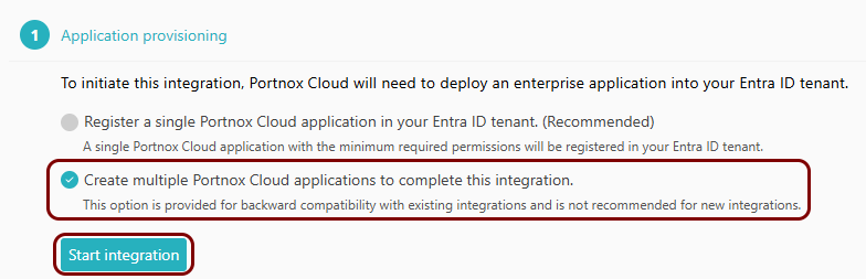 4. In the Application provisioning step, select the following option: Create multiple Portnox Cloud applications to complete this integration. Then, click on the Start integration button.