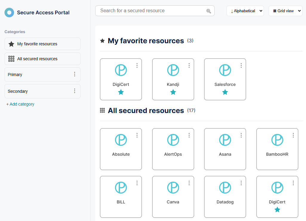 After signing in, users see a set of tiles that represent all configured ZTNA resources, including SSO web applications and hosted resources. Selecting a tile opens the corresponding resource. Users can also select the  ⋮  icon to Add to favorites or Add to category, allowing them to organize resources for easier access. Favorites and categories are stored per user.